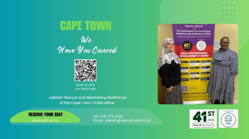 - the provisional SALLR/CCMA seminar programme is out, providing you with a detailed breakdown as to the relevant topics that will receive attention so that you can make an informed decision as to the value that you will gain by attending this event (go to the SALLR home page (www.sallr.co.za) and scroll down to ‘Provisional Programme’)